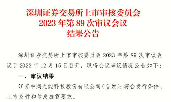 今天,深圳證券交易所創(chuàng)業(yè)板上市委員會(huì)發(fā)布公告:江蘇中潤(rùn)光能科技股份有限公司(以下簡(jiǎn)稱“中潤(rùn)光能”)的首次公開發(fā)行股票申請(qǐng)符合發(fā)行條件、上市條件和信息披露要求。